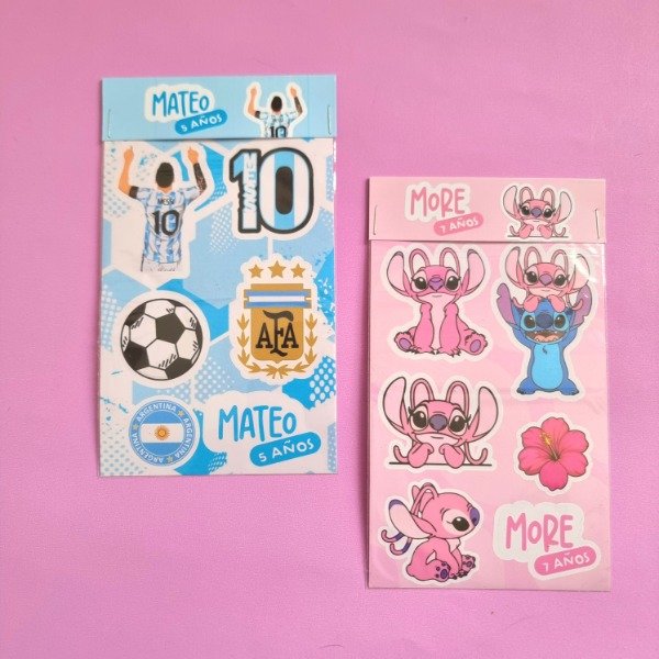 Cada plancha incluye stickers con diseño exclusivo de la temática que elijas, listos para pegar en donde quieran: botellas, carpetas, cuadernos, juguetes, tablets ¡y más!